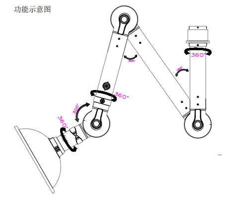 *活动功能:配备三组折叠关节,折叠角度75-300°,一个水平360°旋转、二个末端轴向360°旋转功能;(zl****)